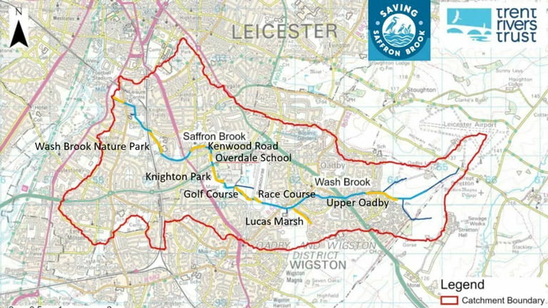 The Saving the Saffron Brook project aims to restore the heavily modified river ecosystem along the Saffron/Wash Brook in southeast Leicester, via direct channel improvements, re-naturalisation and floodplain reconnection, whilst engaging with local communities to bring them closer to nature. The Saffron Brook and Wash Brook are major tributaries of the River Soar in the South East of Leicester, flowing from a rural source near Great Stretton, through the suburban/urban settings of Oadby & Wigston (as Wash Brook) and southeast Leicester (as Saffron Brook), where it joins the River Soar just north of Aylestone Meadows.